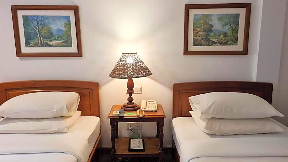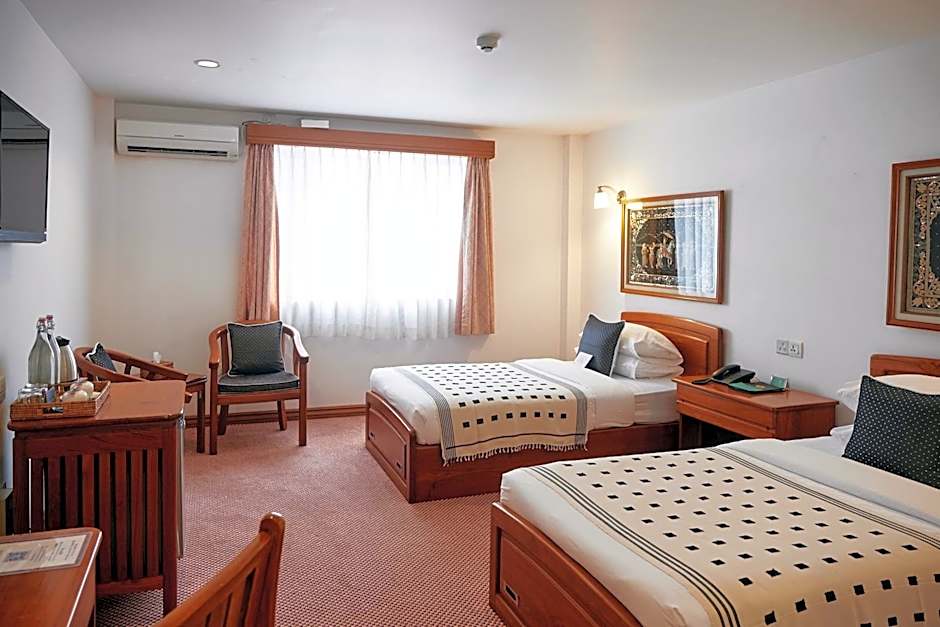 This larger twin room has a seating area, a flat-screen cable TV and tile/marble floor.